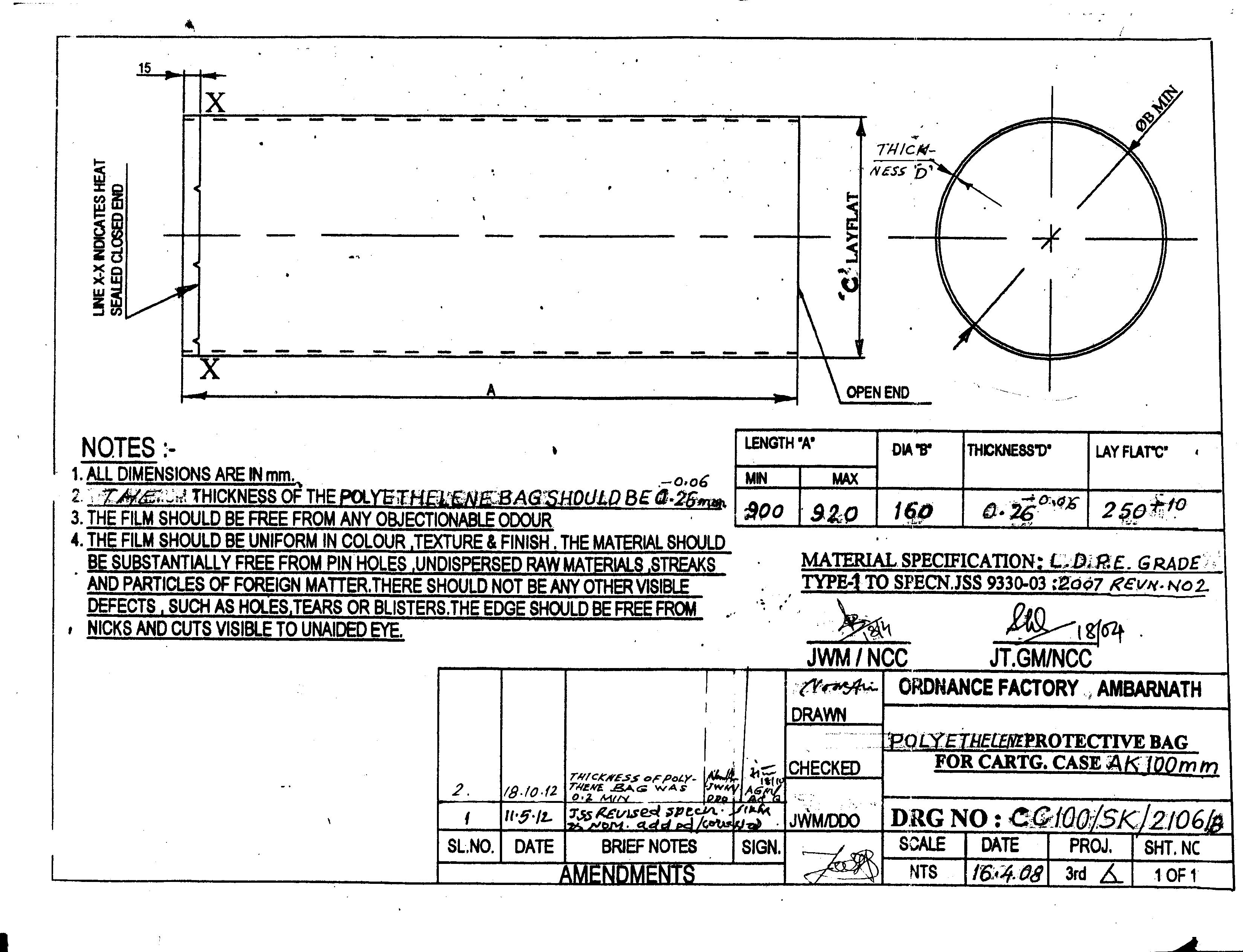 POLYTHENE PROTECTIVE BAG AS PER MATL. LDPE GRADE TYPE 1 TO SPECN JSS 9330-03:2007 REV NO.2 FOR 84MM CG CC OF SIZE LENGTH 440-450 MM, DIA 110, LAY FLAT 173(+10,-0), THICKNESS 0.26-0.06 AS PER DRG. NO. CG84/SK/11003/C DT 14/11/2010 AMENDED UPTO 12/10/2012.
