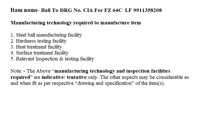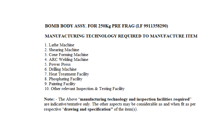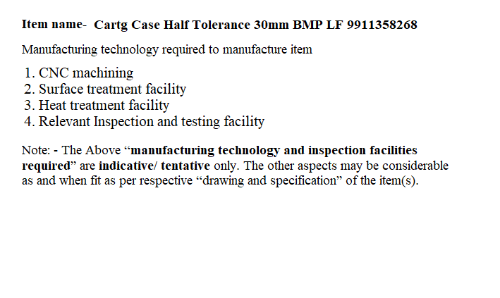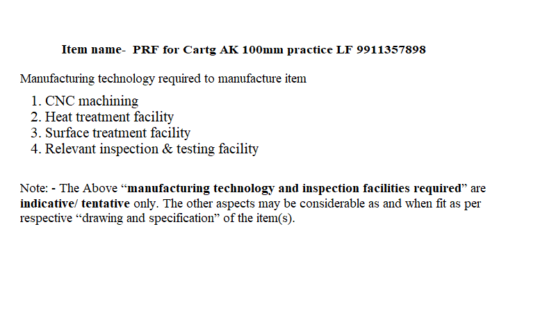 CARTG. CASE (HALF TOLERANCE) FOR 30MM BMP-II GUN 2A42,EMPTY TO DRG NO 3-0105575 SHEET 1 to 4 DC-36579A DT.3-8-99 TO SPECN:PROGRAMMEAND PROCEDURE OF TESTING BY FIRING GUN 2 A42 AS PER SHEET NO3-0105575-0514 -- M3(2SHEETS) DC-34183-A DT.28-7-87 AS PER PARA 2.2 OF APPENDIX 'A' OF SOP CONTROLLERATE OF QUALITY ASSURANCE (A) KHADKI L/NO. Q.A.15506(MS)/I/72 DT.19/06/2009.