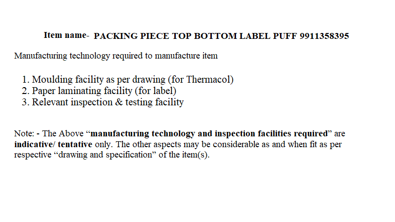 SET OF PROFEEL PACKING AS PER DESIG REF.CIA/AMN/2394 DRG PT.NO.ISV.438 GA DC NO.36948-A DT.27/01/04 CONSISTING OF:-(1)PADDING OF10 NOsGRENADE=01NO.TO DRG PT NO.ISV-2096(2)HOLDERLAUNCHER=01NO.TO DRG PT.NO.ISV.2097(3)BAG BULLETS=01NO.TODRGPTNO.ISV-2098(4)POUCH RING=02 NOS.TO DRG PT.NO.ISV-2099 DC.NO.36948-A DT.27-01-04 FOR ALL ABOVE ITEMS.