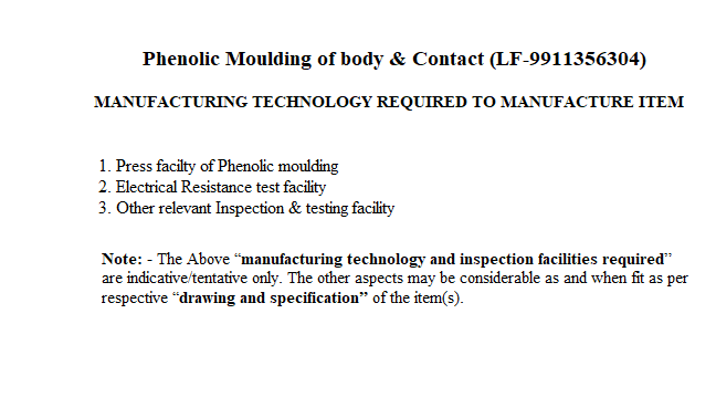 PHENOLIC MOULDING FOR BODY & CONTACT TO DRG NO:OST-B84-410- 78 MOULDED COMPONENTS TO SATISFY PARAMETER OF TESTING ATSHEET NO: 4,5 & 6 OF OST-B84-410:78 MOULDING MATERIAL TOSPECN:- SP-16 OF IPL.