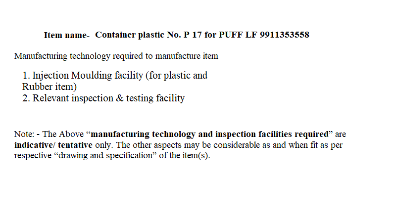 CARRIER, AMMUNITION 11-A (PLASTIC) TO DRG. PT. NO. ISV-468-ADC-37090-A DT 27-01-07 TO SPECN:CQA(A)-2804(m) DC-36202-ADT 7/11/96.NOTE.1:- SPECIAL INSTRUCTION FOR TEST FOR CARRIER AMMN.11AIS ENCLOSED.NOTE 2:-ADVANCE SAMPLE 10 NOS.ARE REQUIRED WHEN ITEM