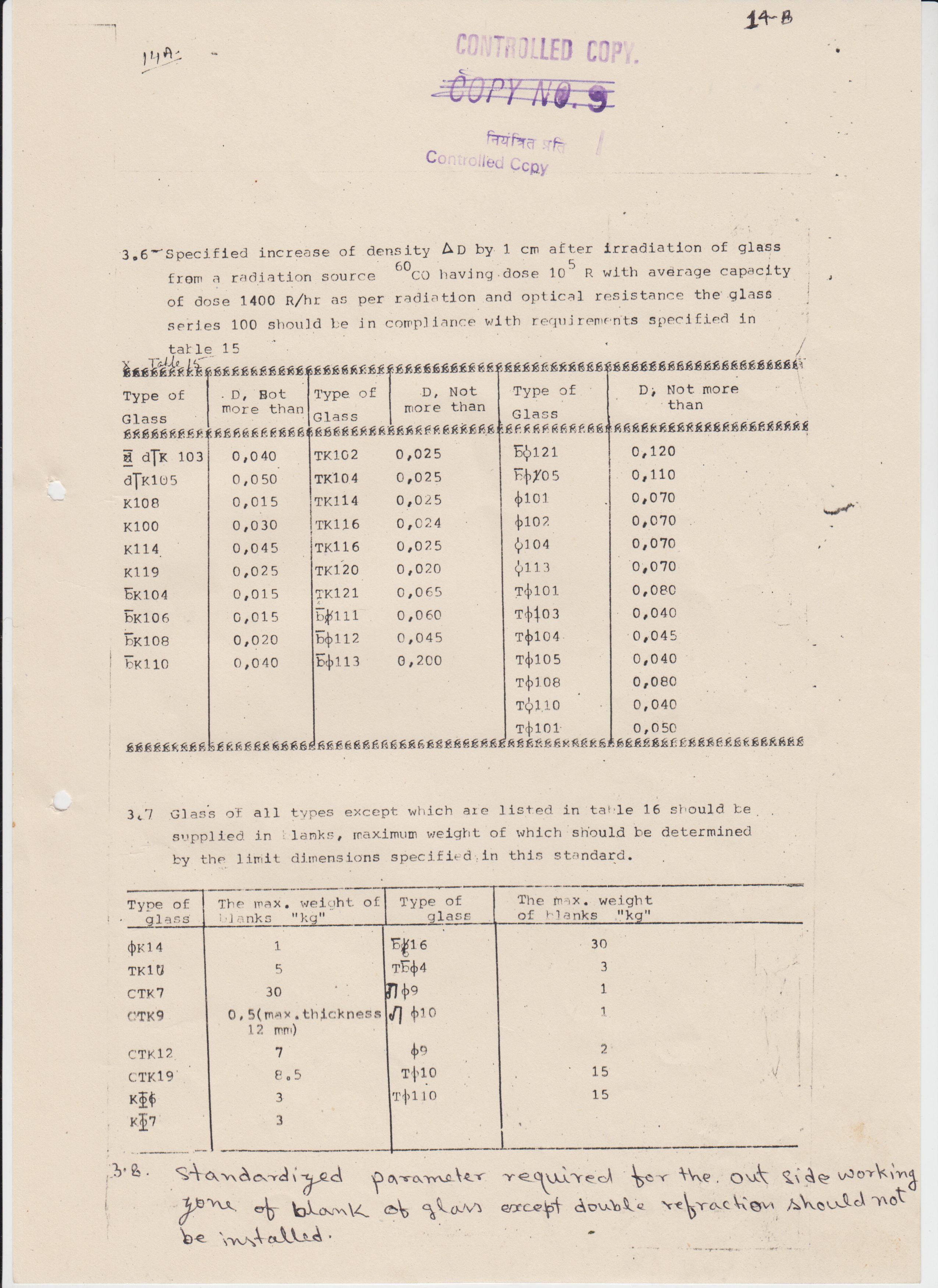 OPTICAL GLASS DBC-610573, IN CYLINDRICAL SHAPE DIA=45MM +1MM-0.5MM, BLANK THICKNESS=14MM +0.5MM-0MM, IS:1400-1960, STRIAE GRADE-A INCLUSION GRADE SMALL-B, FINE ANNEALED SO THAT STRESS BIREFRINGENCE IS NOT MORE THAN 10 NM/CM.