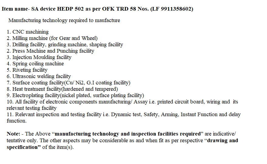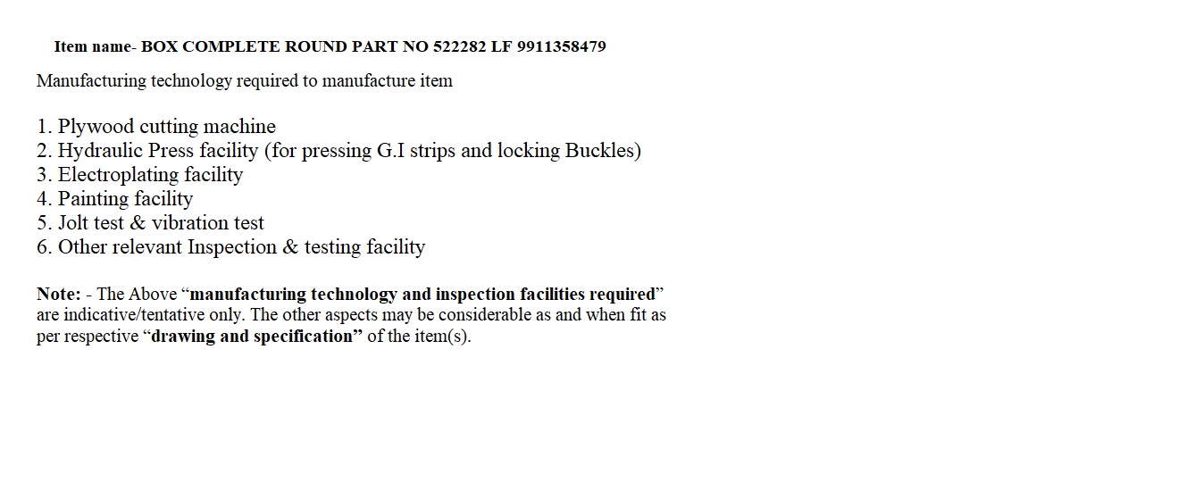 COMBUSTIBLE COMPONENTS FOR PRIMARY AND SECONDARY 125MM FSAPDS PRACTICE (HEMRL/CCC/PS/417 AUG.2017) CONSIST OF.1.COMBUSTIBLE BODY PRIMARY -PRACTICE TO SPEC./DRG.NO. HEMRL/CCC/125-P/1 .2.COMBUSTIBLE INNER CAP PRIMARY-PRACTICE TO SPEC./DRG.NO.HEMRL/CCC/125-P/2 3.COMBUSTIBLE OUTER CAP PRIMARY-PRACTICE TO SPEC./DRG.NO. HEMRL/CCC/125-P/3 4.COMBUSTIBLE CYLINDER PRIMARY-PRACTICE TO SPEC./DRG.NO.HEMRL/CCC/125-P/4A 5.COMBUSTIBLE OUTER BODY SECONDARY-PRACTICE TO SPEC./DRG.NO HEMRL/CCC/125-P/5 6.COMBUSTIBLE INNER BODY SECONDARY-PRACTICE TO SPEC./DRG.NO HEMRL/CCC/125-P/6A 7.COMBUSTIBLE CAP SECONDARY-PRACTICE TO SPEC./DRG.NO. HEMRL/CCC/125-P/7 8.COMBUSTIBLE SLEEVE SECONDARY-PRACTICE TO SPEC./DRG.NO. HEMRL/CCC/125-P/8 A.