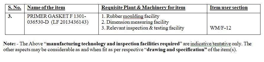 PRIMER GASKET TO DRG NO-F1301-036530-D DC NO.36783-A DT 19/9/01 INDEGENOUS MATERIAL SPECN:-IND/ME/884:2015 COMPOUND NO: C-60 HARDNESS DEGREE BS-60(+5/-4) DC NO. 5403-ME DATE1-02-2016 COMPATIBLE WITH RDX TNT.