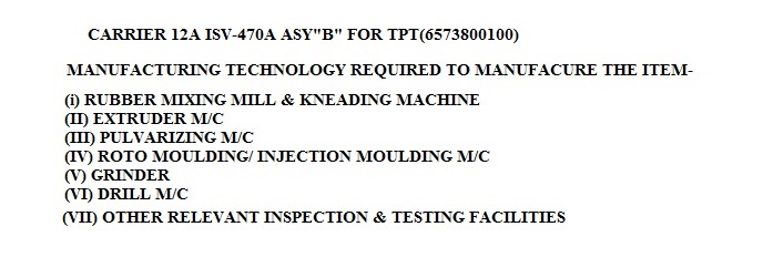 CARRIER, AMMUNITION 12-A (PLASTIC) TO DRG. PT. NO. ISV-470-ADC 36999-A DT.02-02-05 WITH SHOCK ABSORBER ASSEMBLY "B" DRG.PT. NO. ISV-147-SA DC-35855-A DT. 23.11.94, SPECN:- CQA(A)2804 (m) DC-36202-A DT 7/11/96.NOTE 1:-SPECIAL INSTRUCTION FOR TEST FOR CARRIER AMMN.12A IS ENCLOSED.NOTE 2:-ADVANCE SAMPLE 10 NOS.ARE REQUIRED WHEN ITEM IS BEING DEVELOPED/SUPPLIED BY NEW SOURCE/FIRM.