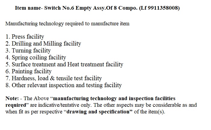 SWITCH NO.6 EMPTY ASSEMBLY OF 8 COMPONANTSDRG.NO.D.D(L)- 15270 D.C.NO.36836-A DT.14-6-02 EXCEPT SUB ASSEMBLY 2719.LIST OF 8 COMPONENT.(1) SAFETY PIN DESIG.REF.2718 DC NO.34267-A DT.13/11/87(2)STRIKER SPRING DESIG.REF.2735 DC No.34497-A dt.08-12-88(3)BODY DESIG.REF.2738 DC No.37116-A dt.20-06-07(4)LID DESIG.REF.2739 DC No.34346-A dt.21-03-88(5)SEAR DESIG.REF.2740 DC No.34346-A dt.21-03-88(6)STRIKER DESIG.REF.2741 DC No. 34346-A dt.21-03-88(7)PIN(SEAR) DESIG.REF.2742 DC No.31545-A(8)PIN(LID) DESIG.REF.2743 DC No.31545-A