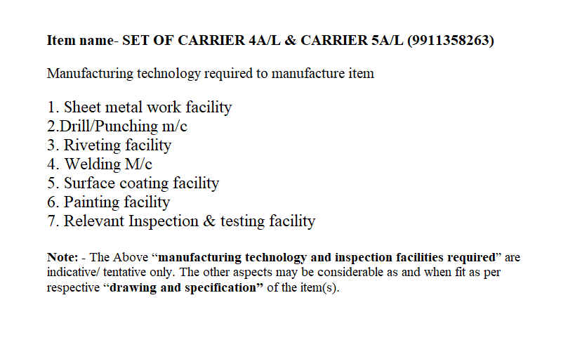 SET OF CARRIER 4A/L AND CARRIER 5A/L SPECN.DETAIL AS BELOW:-AMMUNITION CONTAINER CARRIER-4A/L(STEEL) TO DRG. PT NO. ISV-335A DC(I) NO 33739-A DT 30/3/85 TO SPECN:-IA 1169(n) DC NO.35576-A, AIDE MEMOIRE P/11.AND AMMUNITION CONTAINER CARRIER-5A/L (STEEL) TO DRG. PT NO. ISV-336A DC(I) NO 33739-A DT.30/3/85 TO SPECN:-IA 1169(n) DC NO.35576-A,AIDE MEMOIRE P/11NOTE 1:-SPECIAL INSTRUCTION FOR TEST FOR SET OF CARRIER 4A/L AND CARRIER 5A/L IS ENCLOSED.NOTE 2:-ADVANCE SAMPLE 05 SETS ARE REQUIRED WHEN ITEM IS BEING DEVLOPED/SUPPLIED BY NEW SOURCE/FIRM.